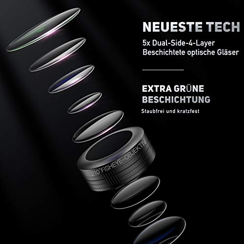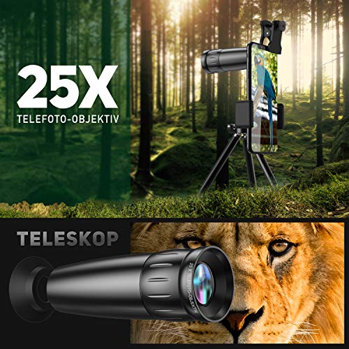 【Einzigartige Funktion】25x Teleobjektiv – Vergrößern entfernter Objekte (Ohne Zoom); 210° Fisheye Objektiv – Erstellen eines einzigartigen kreisförmigen mysteriösen Effekt Fotos; 25x Makroobjektiv zur Verwendung Nahaufnahmen von Blumen, Insekten und kleinen Objekten (Abstand: 1 bis 3 cm); 4K HD 0,65x Weitwinkelobjektiv: Erweitern Sie das Sichtfeld und vergrößern Sie den Bildschirmraum (Weitwinkel und Makro werden zusammengesetzt); Kaleidoskop Objektiv – verwendet eine wundervolle Welt entdecken.