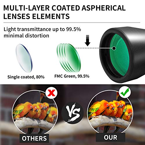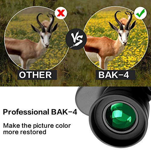 [Hohe Auflösung] Hoher Brechungsindex BAK4 Porro Prism eliminiert Streulicht und erhöht die Farbwiedergabe auf 99.99%. Die grüne FMC -Antireflexionsbeschichtung reduziert das reflektierte Licht des Objektivs und verbessert die Lichtdurchlässigkeit, Bildhelligkeit und Bildschärfe. Dieses binokulare Fernglas kann in dunklen Umgebungen Sicht bieten (im Kontrast dazu nicht in völlig dunklen Umgebungen).