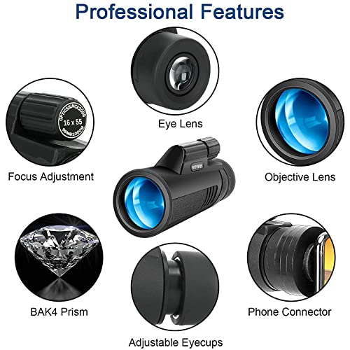 16×55 Monokular Teleskop mit Smartphone Halterung & Stativ, 2022 HD Monokular für Jagd Klettern Vogelbeobachtung Konzert…