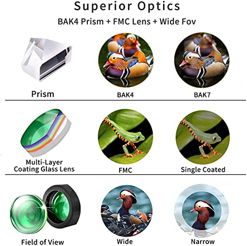 ★【Hochauflösende Bilder】Hoher Brechungsindex BAK4 Porro Prism eliminiert Streulicht und verbessert die Farbwiedergabe auf 99,99%. Die grüne FMC-Antireflexbeschichtung reduziert das reflektierte Licht in der Objektivlinse und verbessert die Lichtdurchlässigkeit, Bildhelligkeit und Bildschärfe. Die integrierte Nachtsicht bei schlechten Lichtverhältnissen hilft Ihnen, Dinge bei schlechten Lichtverhältnissen zu sehen.