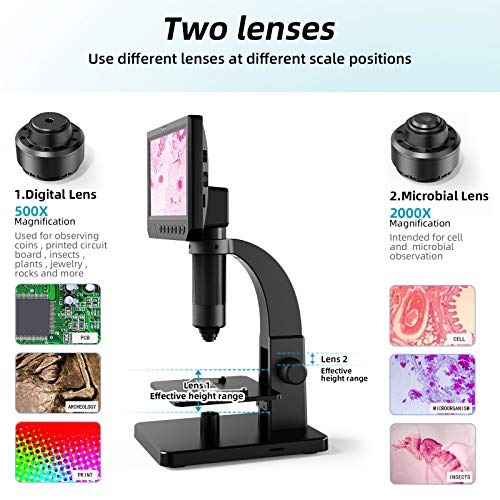 ✅【Dual Lenses For Versatile Uses】Kreativ ausgestattet mit digitaler Linse und optischer Linse, 500x digitale Linse („Lens 1“) ermöglicht es Ihnen, Details von makroskopischen Objekten wie Fehlermünzen, Leiterplatte, Insekten, Pflanzen zu beobachten. 2000x optische Linse („Linse 2“) ermöglicht es Ihnen, Zellen, Mikroorganismen und Dias mit mikrobieller Linse zu beobachten.Knopf Fokusbereich 2-55mm.