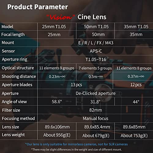 T1.05 entriegelte große Blende: Das entklickte Blendenring-Design garantiert eine ruhige und reibungslose Videoaufnahmen. Und die T1.05 große Blende kann eine niedrigere ISO und eine schnellere Verschlusszeit vulgo in Umgebungen mit schlechten Lichtverhältnissen gewährleisten.