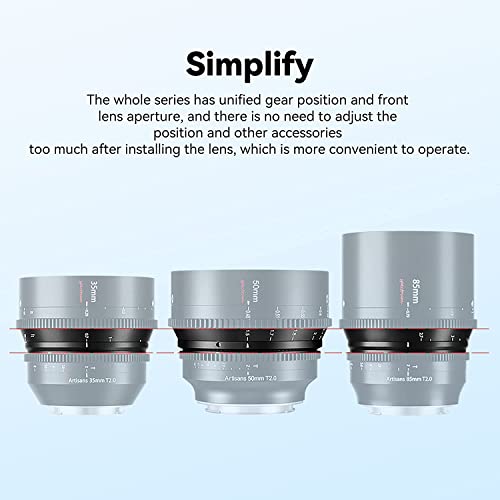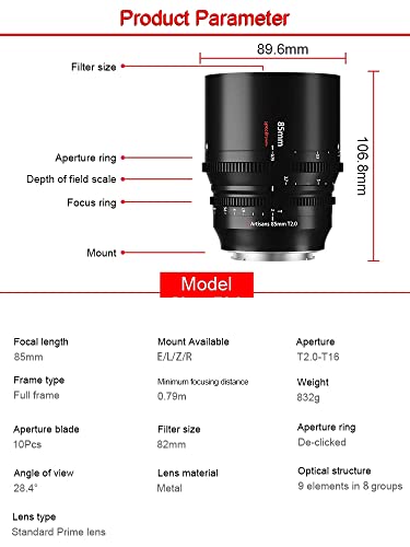 Verwenden Sie dieses 85 mm T2.0 Spectrum Prime Cine Objektiv von 7artisans Photoelectric auf Ihrer Full-Frame-Kamera, um scharfe auch hochwertige Bilder zu erzielen. Eine maximale Blende von T2.0 auch eine Linsenkonstruktion von 9 Elementen in 8 Gruppen qua 10 Iris-Klingen generieren ein glattes, kreisförmiges Bokeh qua minimaler Fokusatmung. Das Objektiv hat einen 28,4° Standpunkt auch 0,8Mod Cinema-Standard-Getriebe auf Fokus auch Iris statt dessen intuitive manuelle Angleichung. Fokusabstand auch Blendenmarkierungen befinden sich auf beiden Seiten des Objektivs in Metern auch Füßen. Die 85 mm Brennweite hat einen minimalen Fokusabstand von 6,6 m. Ein 82-mm-Filtergewinde ermöglicht es Ihnen, Filter Ihrer Annäherung anzubringen, um die Lichtqualität auch Effekte des Objektivs weiter anzupassen.