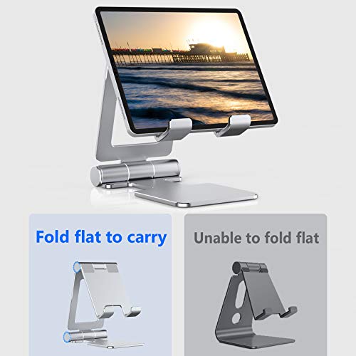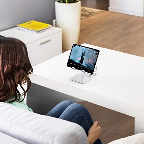 【Multi-Angle-Ausarbeitung/Unterhaltungsassistent】Der Tablet Ständer ist ergonomisch gestaltet, kann anpassungsfähig auf die ideale Höhe und Winkel eingestellt werden. Es unterstützt die vertikale und horizontale Platzierung, um Ihren unterschiedlichen Anforderungen gerecht zu werden. Das Design mit niedrigem Schwerpunkt, der längliche Haken, das rutschfeste Silikonpolster an der Unterseite und der Außenkörper aus Aluminiumlegierung bieten Ihnen stabile Umgebung bei der Verwendung, die langlebiger ist.