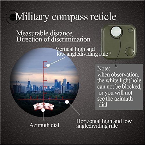 Das Fernglas mit Kompass des Seemannes – Eingebautes Abrichtlineal für die Entfernungsmessung und eingebauter Kompass für die Orientierung. Durch die Angabe des Lineals kann man direkt die Abfuhr des Objekts auf dem linken Okular berechnen. Mit dem integrierten lichtemittierenden Kompass kann man die Ausrichtung berechnen (In einer dunklen Umgebung wird das Abrichtlineal und der Zirkel durch den Licht-Knopf beleuchtet)