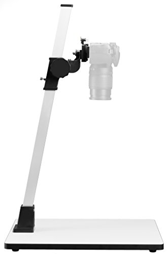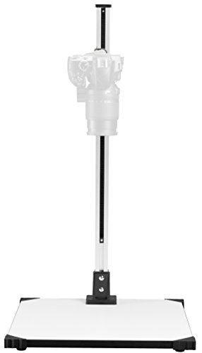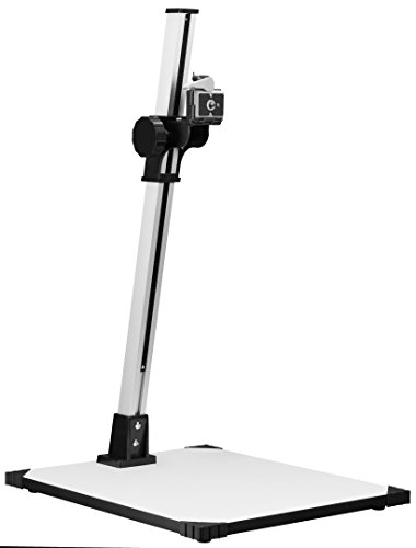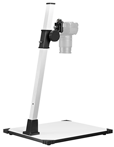 Das Reprostativ dient zum Fotografieren von Dokumenten oder aka kleinen Gegenständen. Dank der Schnellwechselplatte (1/4“ und 3/8“) können Sie Ihre Kamera schnell und einfach auf der 73 cm hohen Stativsäule des Copy Stands befestigen. Diese ist mit einer Zahnstange ausgerüstet, sodass die Höhe stufenlos eingestellt werden kann. Auf der 40 x 48 cm großen Ablichtungsfläche lassen sich zu fotografierende Objekte kleinlich am Boden der Kamera positionieren. Die Anlieferung erfolgt in zwei Paketen und enthält bereits das nötige Montagematerial zur Befestigung der Säule an der Grundplatte. Ebenfalls im Lieferumfang enthalten ist eine kleine Rändelschraube zur Arretierung der Kamerahalterung in der gewünschten Höhe. Statt dessen schattenfreie Aufnahmen zu verstehen geben wir den zusätzlichen Einsatz von Dauerlichtlampen.