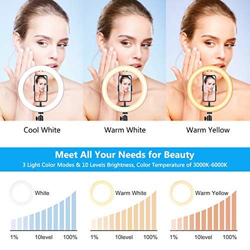 ✨【3 Farben 10 Helligkeiten Ringlicht】Das 10 zoll ringleuchte verfügt über 3 Lichtfarbmodi: Kaltes Weiß, Warmes Weiß, Warmes Gelb. Jeder Beleuchtungsmodus verfügt über 10 Stufen mit einstellbarer Helligkeit zwischen der Farbtemperatur von 3000k und 6000k Mit 120 LED-Lampen macht echtes und zartes Licht Ihre Gesichtskontur dreidimensionaler, wenn Sie das Video aufnehmen.