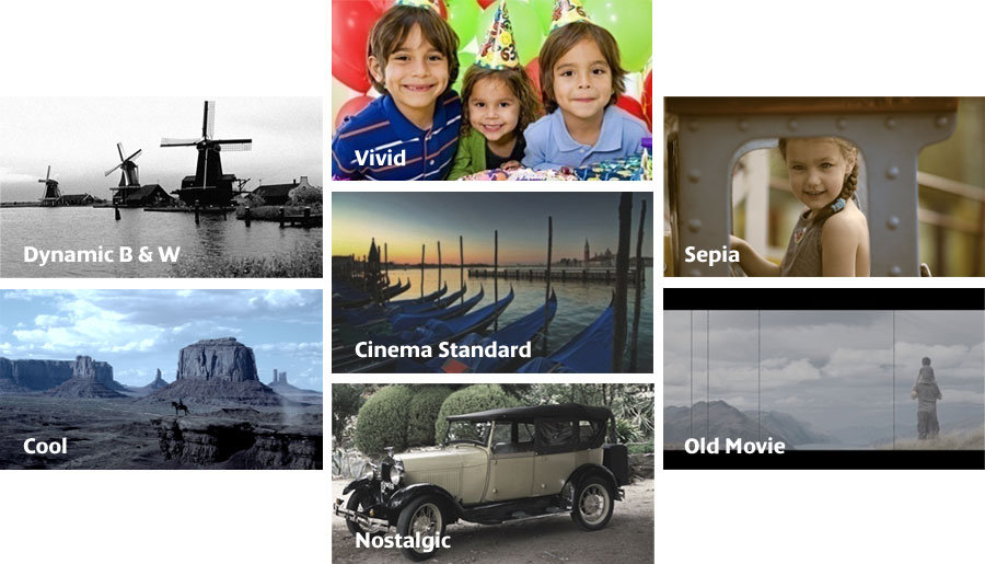 Cinema-Look Filter verhelfen Ihnen zu noch mehr Kreativität – 7 einstellbare Farbfilter helfen Ihnen bei der Ausbelichtung des perfekten Videos. Oder Sie versehen Ihre Videos mit lustigen Effekten durch eine Verzierung per Fingertipp – ganz ohne PC.