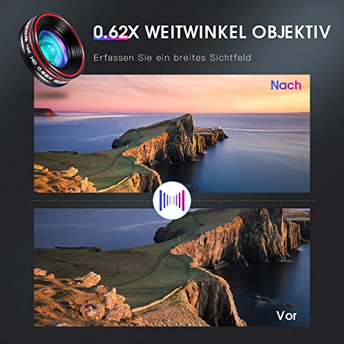 1. Das 10-in-1-Kit bietet was auch immer, was Sie brauchen: 4 Objektive(22x Zoom Teleobjektiv, 235° Fischaugenobjektiv, 25 Makro-Objektiv und 0,62 Weitwinkelobjektiv), Bluetooth-Fernauslöser, Stativ, Objektivclip, Reinigungstuch, Smartphonehalter und Tragetasche um mühelos hübsche Fotos auf Ihrem Handy zu zurechtmachen.