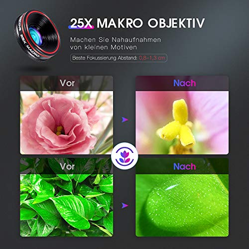 2. Geschaffen, um vielseitig zu sein: das Teleobjektiv fängt weit entfernte Motive ein, das Makroobjektiv nimmt Nahaufnahmen auf(0.8-1.2cm), das Weitwinkelobjektiv sorgt für wunderbare Landschafts-/Gruppenaufnahmen und das Fischauge-Objektiv produziert kreisrunde Bilder. Der Bluetooth-Auslöser eignet sich perfekt für Selfies und stabile Stativaufnahmen.