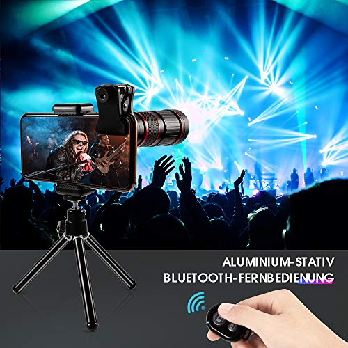 1. Das 10-in-1-Kit bietet alles, was Sie brauchen: 4 Objektive(22x Zoom Teleobjektiv, 235° Fischaugenobjektiv, 25 Makro-Objektiv und 0,62 Weitwinkelobjektiv), Bluetooth-Fernauslöser, Stativ, Objektivclip, Reinigungstuch, Smartphonehalter und Tragetasche um mühelos hübsche Fotos auf Ihrem Handy zu machen.