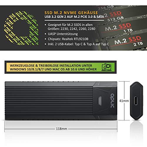 Umfassende Kompatibilität: Das Festplattengehäuse unterstützt sowohl PCIe als bekannt als SATA! Beispiele für PCIe: Samsung 970 EVO (Plus / PRO), Crucial P1; Corsair Force MP510; WD Black SN750, Intel 760P; ADATA XPG SX8000; Kingston A100; Seagate BarraCuda 510/FireCuda 510. Ebenso kompatibel mit z.B. M.2 SATA NGFF SSD, AHCI SSD und Key B und M-Sata SSDs.