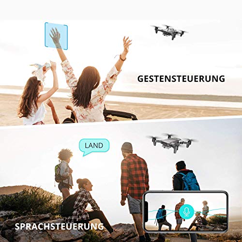 Sprach- und Gestensteuerung: Ermöglichen Sie die Steuerung der Drohne mit einfachen Sprach wie „Takeoff“, „Landing“. Stellen Sie ein V-Zeichen oder eine Handfläche vor die Kamera. Die Drohne kann automatisch Fotos oder Videos einsaugen, was sich gut für Selfies eignet.