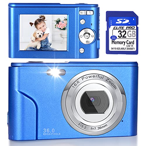 Digitalkamera, FHD 1080P 36.0 MP Mini Videokamera Wiederaufladbare Fotokamera Digitalkamera mit 32GB SD-Karte 16X…