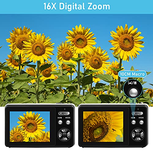 【16X Digitalzoom】Die Digitalkamera unterstützt den 16X Digitalzoom. Sie können die Taste „T“ oder „W“ drücken, um Ihren Aufnahmeinhalt je nach Bedarf zu vergrößern oder zu Reduzieren, ohne sich Gedanken über die Bildqualität machen zu müssen. Die Makrofunktion der digitalkamera wird Sie überraschen. Richten Sie das Objektiv auf das Objekt, das Sie Einsaugen möchten, und drücken Sie innerhalb von 10 cm die Makrotaste, um problemlos eine klare Nahaufnahme zu erhalten.