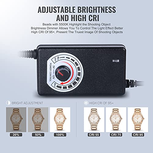 【EINSTELLBARER DIMMER】 Drehen Sie den schwarzen Dimmer von links nach rechts, um die Helligkeit von 0% auf 100% zu konvertieren. Stimmen Sie die für Ihre Aufnahmeanforderungen am besten geeignete Helligkeit. Ein hoher CRI ≥ 95 macht das Licht flexibler und macht es einfacher, schöne Fotos aufzunehmen, und zieht mehr Kunden für Ihre Ware an.
