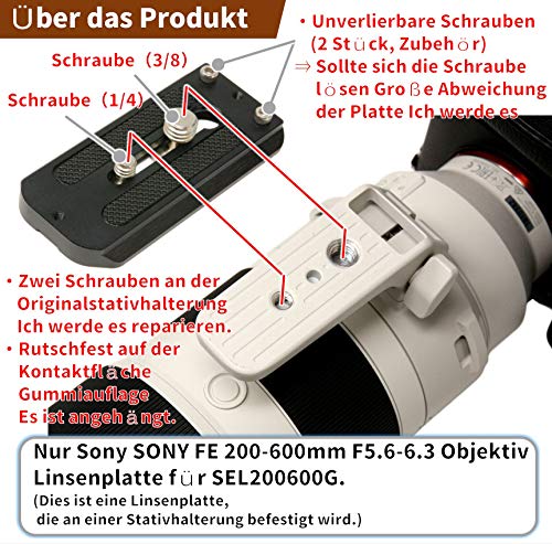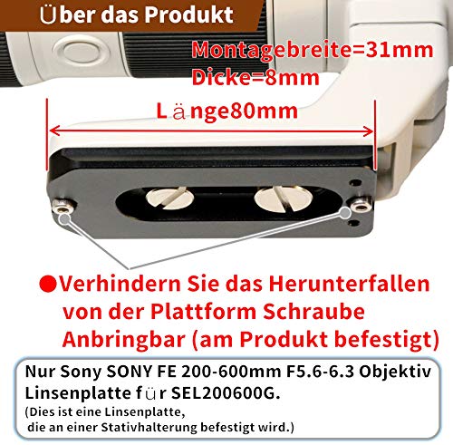 [Materialien] Das Material besteht aus Aluminium und ist nach dem Sicheln schwarz gefärbt und hart eloxiert. Da es durch Ausschneiden aus einem Aluminiumblock hergestellt wird, hat es eine hohe Steifigkeit und ist sehr solide. Die detaillierten Abmessungen der Platte sind offenbart. Andere Objektive können verwendet werden, solange der Stativsockel jedes Objektivs den Abmessungen der Platte entspricht. Die Befestigungsschrauben sind ebenfalls mit einer 1/4 Schraube und einer 3/8 Schraube vormontiert, können nichtsdestotrotz entfernt oder ersetzt werden.