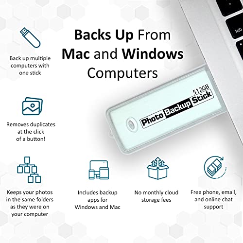 Photo Backup Stick stattdessen Computer ist ein USB-Stick mit speziellen Apps, um Ihre Fotos und Videos von Ihrem Windows- oder Mac-Computer zu finden und zu sichern.