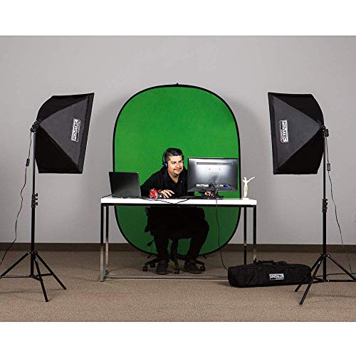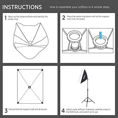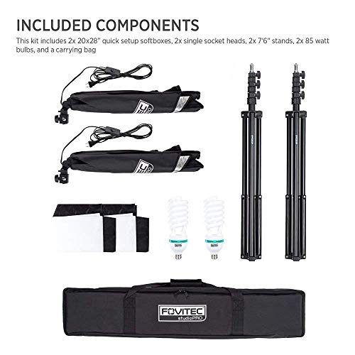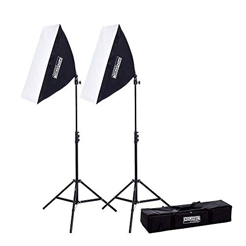 Inhalt: 2 Softboxen (51 x 71 cm), 2 Einzelgewindeköpfe, 2 Stative (2,3 m), 2 Leuchtmittel (85 Watt), 1 Tasche.
