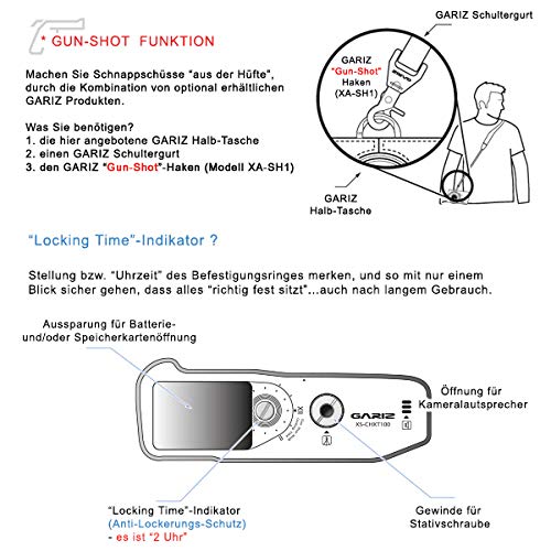 * ‚Gun-Shot-Mode‘, schnelles Schnappschuss Ablichten ‚allesamt der Hüfte‘, in Verbindung mit optional erhältlichem GARIZ Karabinerhaken XA-SH1N und Schultergurt
