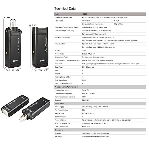 [Tiny Body Pocket Flash] Ausdehnung: 168 * 75 * 500mm.Nettogewicht: 560g. Godox AD200 Speedlite Monolight ist kompatibel Per Canon E-TTL, Nikon i-TTL ferner Sony TTL usw.