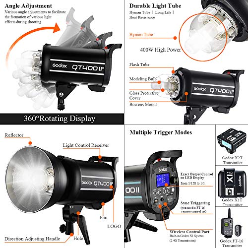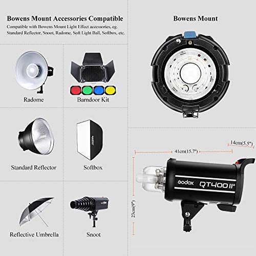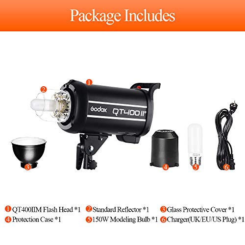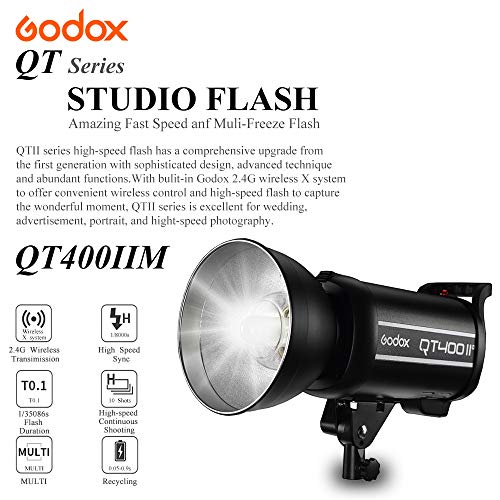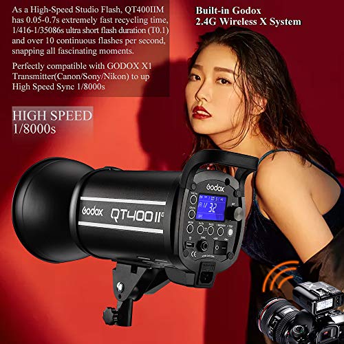 Kompatiblität: Der Godox QT400IIM Studioblitz aka Unterstützung an Stelle High-Speed-Sync 1/8000s von kompatibel mit den meisten Kameramarken, z. Canon, Nikon, Sony, Fuji, Olympus, Panasonic, Pentax-Kameras. (mit Transmittter X2T, X1T, Xpro, XT32, XT16, FT16 usw.)