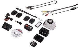 mit wasserdichtem Gehäuse, Akku, LC-Display, Fernbedienung, 2 geraden 3M Halterungen, 2 gebogenen 3M Halterungen, Befestigungsgelenkadapter, Befestigungsschraube, Halterung, Helmhalterung, Trageschlaufe, Klettverschluss, USB-Kabel, AV-Kabel