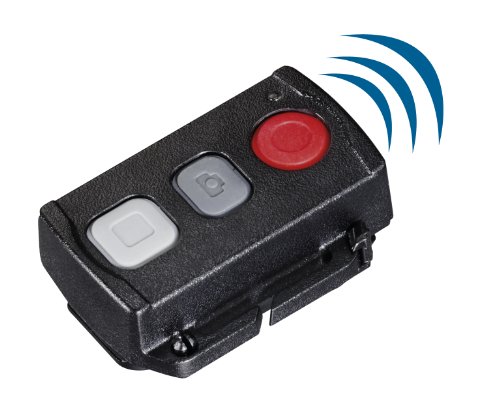 Mit der beiliegenden Fernbedienung können Sie die Videoaufnahme starten und abbrechen, eine Fotoaufnahme auslösen und die Laserfunktion zum Ausrichten der Kamera aktivieren und beenden.