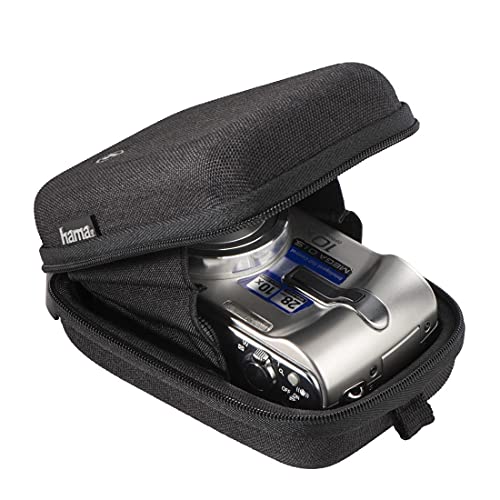 Hama Kameratasche Ambato (kleine Fototasche für Kompaktkamera 6,5 x 4,5 x 11 cm, Hardcase für Wandern, Fahrrad, Trekking, Hartschale mit Gürtelschlaufe, zum Umhängen, Karabiner für Rucksack) schwarzBeim Outdoor-Programm ist die kleine Digitalkamera am besten in einem Hardcase geschützt. Diese Kamera Hartschale ist alle stoßsicherem und robustem EVA- Schaum. Die Kameratasche bietet vielfältige Tragemöglichkeiten: Mit der Gürtelschlaufe wie eine Bauchtasche verankern, den Tragegurt um den Hals hängen oder bequem mit dem Karabiner am Rucksack oder anderen Taschen unterstützen. Die Ersatz-Speicherkarte bekommt ihren Platz im flachen abseits Fach innen. Über den Doppelreißverschluss kommt man schnell an die Kamera heran. Diese kann dank Aufklappschutz nicht alle der geöffneten Fototasche herausfallen. Mit den schlanken Maßen 6,5 x 4,5 x 11 cm und dem ultraleichten Gewicht von 115 Gramm kann die Schalentasche allenthalben mit und passt in jede Tasche und jedes Reisegepäck. Technische Details Vollziehung: Hardcase Material: Ethylenvinylacetat (EVA) Gewicht: 115 g Größencode: 60M Innenmaß B x T x H: 6,5 x 4,5 x 11 cm Farbe: Schwarz Farbton: Schwarz Produktbereich: Guss und Video Anordnung: Hardcase Ambato Entsprechend für: Guss Verwendungszweck: Guss