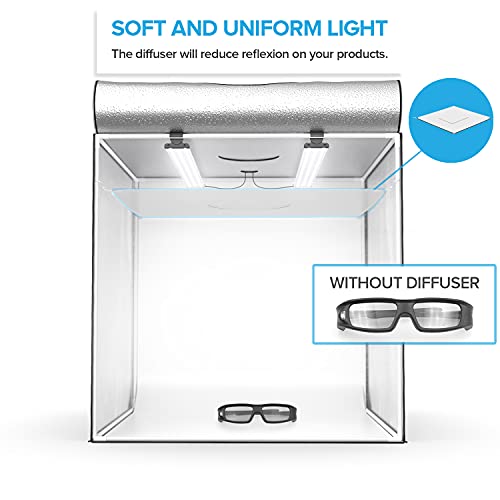 ENTWICKELT FÜR ANPASSBARKEIT: Mehrere Öffnungen vorne und oben ermöglichen es Ihnen, den gewünschten Winkel basierend auf der Größe der zu fotografierenden Objekte auszuwählen. Sie brauchen sich keine Gedanken über Reflexionen auf glänzenden Objekten zu machen, da ein lichtstreuendes Gewebe mitgeliefert wird, um Reflexionen zu eliminieren und eine gleichmäßige Beleuchtung zu gewährleisten.
