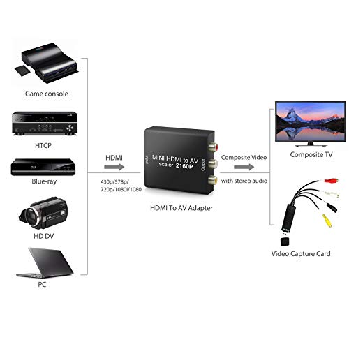 Mini HDMI zu AV Passstück: ergänzen digitale HDMI Video Audiosignale in AV Videosignale (CVBS) und L/ R Stereoaudiosignale. Dagegen HD-Geräte mit HDMI-Ausgang können über RCA/ AV an analoge TV-Röhrenmonitore oder Projektoren angeschlossen werden