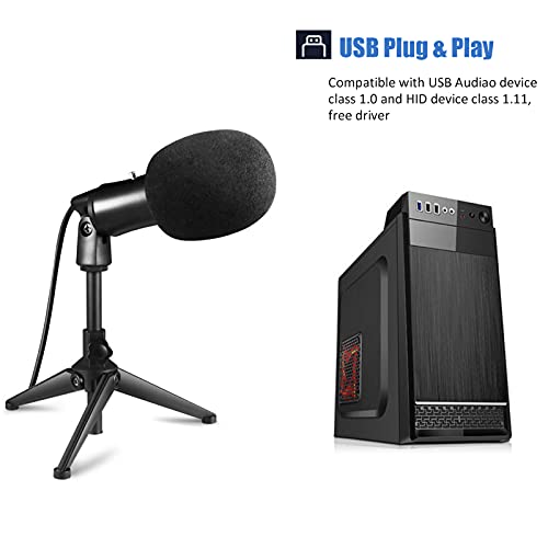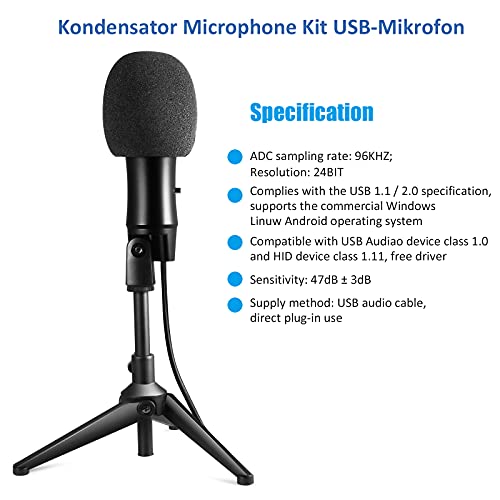 USB Plug and Play: Das Kondensator Microphone mit Ständer ist kompatibel mit USB Audiao Geräteklasse 1.0 und HID Geräteklasse 1.11, unterstützt das kommerzielle Betriebssystem Windows-Linuw-Android.Schlussfolgern Sie das Mikrofon einfach an den USB-Port Ihres Computers an, keine Treiberinstallation erforderlich.