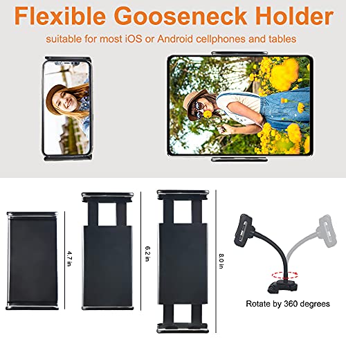Flexibler Schwanenhals-Handy/Tablet-Halter – Die universelle Handyhalterung kann auf bis zu 8,1 Gebühr verlängert werden, um 360° drehbarer Schwanenhals-Halter, geeignet für die meisten iOS- oder Android-Handys und Tablets auf dem Marktgebiet. Die eingebaute 1/4-Gebühr-Universalschraube an der Oberseite des Ständers ermöglicht die Befestigung von Zubehör wie Kameras, Webcam, LED-Ringleuchten, Videoleuchte usw.