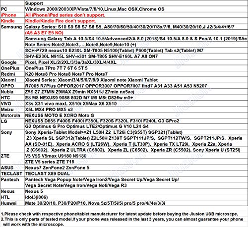 Mit Typ C / Micro-USB-Anschluss können Sie das Mikroskop auf OTG Android Handy verwenden. Das Mikroskop funktioniert auch auf Mac, Windows, Linux und Chrome. Beachten Sie, dass dieses Mikroskop nicht auf iPhone oder iPad funktioniert, ausgenommen, Sie kaufen eine Wi-Fi-Box von Jiusion Brand.