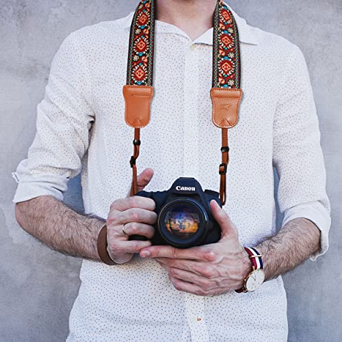 📷WIDE AND COMFORTABLE : The camera strap is made of high quality cotton, retro embroidery process , 2 inches(5 cm) ultra-wide cotton strap design , more breathable , Wear around your neck , cross body, or over one shoulder ! The wide , comfortable cotton strap will Relieve the pressure on your shoulders and neck when using the camera for extended periods of time,making you more comfortable to use.