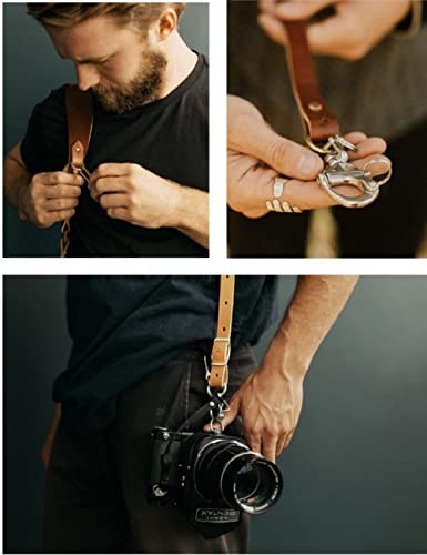 Das Camera Harness ist aus echtem hochwertigem Leder gefertigt und hält zwei Kameras bequem an der Hüfte und. Die Gurte des Gurtzeugs liegen in einem „X“-Muster über Ihrem Rücken für zusätzlichen Halt. Der Speed Clutch-Mechanismus ermöglicht es der Kamera, einfach entlang des Gurtzeugs auf Augenhöhe zu flutschen.