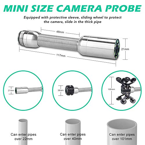 【22mm DURCHMESSER SONDE & 30M KABEL】 – Der Sonden Durchmesser der Inspektionsendoskop beträgt 22 mm, sodass Sie ungeachtet den Rohr- oder Lochdurchmesser besser als 25 mm nachprüfen können. Das halbstarre Kabel hilft beim Drücken und Ziehen des Kameraobjektivs durch unterirdische enge Umgebungen. Es ist ein professionelles Inspektionsgerät für Klempner / Entsperrunternehmen / sanitär dienstleistungsunternehmen/ Bauunternehmer