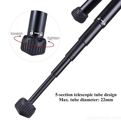 Gefertigt ganz robustem Leichtmetall. Jeglicher Oberflächen wurden zusätzlich eloxiert – Leichtes Leichtmetall Stativ von Kingjoy – 5 Stativbeinsegmente unter Zuhilfenahme von Twist Lock Bildnis – automatisches Stativbein-Rastsystem – Sichere Gefangennahme in drei verschiedenen Positionen – 360° Kugelkopf unter Zuhilfenahme von 1/4″ Schraube ebenso Schnellwechselplatte – integrierter Haken zur zusätzlichen Stabilisierung – einfacher Transport im Zuge mitgeliefertem Beutel