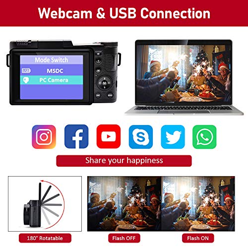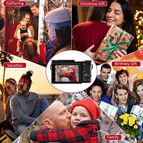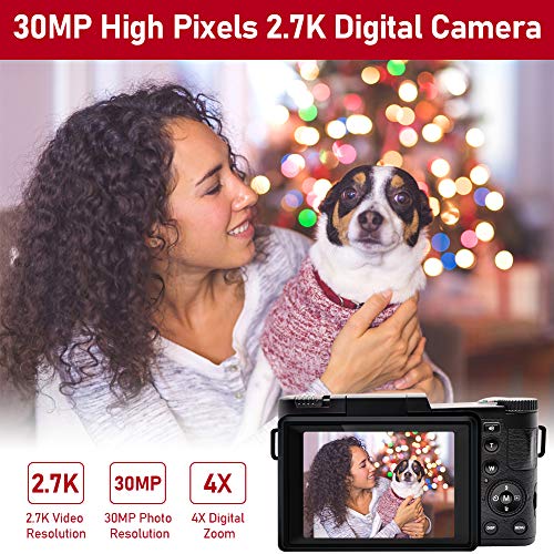 ♥【Digitalkamera mit Flip-Screen】 Diese kompaktkamera ist mit einem 3-Steuer-Ultrahochauflösungsbildschirm ausgestattet und kann für Selfies um 180 Grad gedreht werden, um den unterschiedlichen Anforderungen der Darstellung gerecht zu werden. Die fotoapparat digitalkamera nimmt lebendige Fotos und Videos mit einer Bildauflösung von 30 MP und einer Videoauflösung von 2,7 K auf. Mit dem 4X Digitalzoom können Sie einem Motiv viel näher kommen und die feineren Details in Ihren Fotos und Videos erfassen.