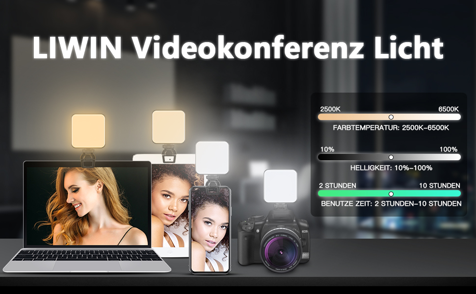 Einstellbare Lichtfarbtemperatur: LIWIN Videokonferenz Licht hat einen dimmbaren Lichtmodus, 3 Sekunden an/aus, 3 Farbtemperaturen (weiß/warm/natur) 2500k-6800k. Mit hochwertigen 64 Lampenperlen ist die Helligkeit von 10 % bis 100 % einstellbar und der Bestrahlungsabstand beträgt 3-6 m. Stellen Sie die Helligkeit stufenlos ein, um sich besser an Umgebung anzupassen. Die höhere Farbwiedergabe machen Ihr Make-up natürlicher und schöner, was sich besser für Live-Übertragungen oder Selfies eignet.