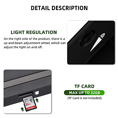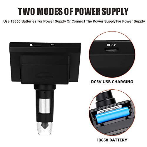 Praktisches Design: Hochwertige verstellbare Halterung, rutschfestes Design an der Unterseite des Mikroskops, kann mit 18650-Akku oder USB aufgeladen werden, Unterstützung zum Einsetzen einer 32-GB-TF-Karte (nicht im Lieferumfang enthalten) zum Resorbieren von Fotos und Videos für die Netzwerkfreigabe und zum Ablegen von Computern.