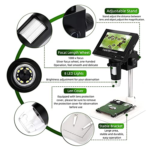 4,3-Aufschlag-LCD-Digitalmikroskop: Erstaunliche Bilder und Videos auf einem 4,3-Aufschlag-Bildschirm. Die rechtseindeutige Relation des Mikroskops beträgt 1000, was der Standard für Mikroskope bester Qualität ist. Sein Kopf dreht sich reibungslos und erleichtert die Verwendung des Mikroskops. Präzise Fokussierung ermöglicht die Probe schnell und klar fokussiert werden.