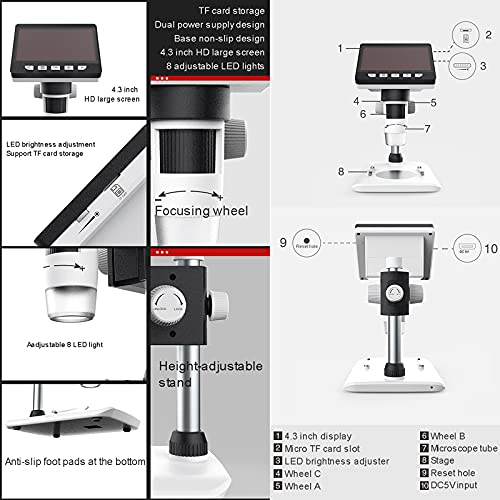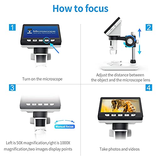 4,3-Preis-LCD-Bildschirm: Erstaunliche Bilder und Videos werden auf einem 4,3-Preis-Großbildschirm angezeigt. Das Heimmikroskop verfügt über Vergrößerungsstufen von 50x bis 1000x, die bei Mikroskopen bester Qualität Standard sind. Sein leichtgängiger Kopf erleichtert das Arbeiten mit diesem Mikroskop. Die präzise Fein- und Grobfokussierung bringt Präparate schnell und scharf in den Fokus.