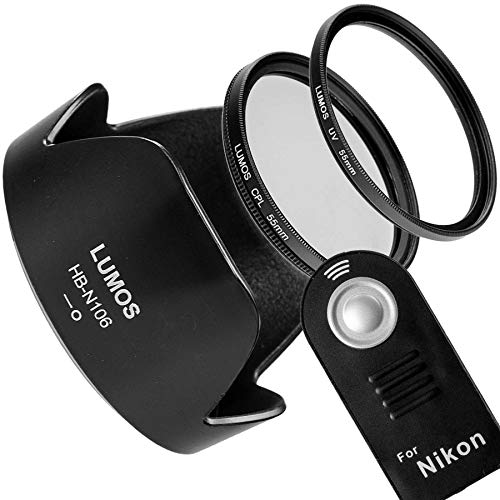 Lieferumfang: 1x Bajonett Gegenlichtblende LUMOS HB-N106 / 1x LUMOS slim UV Filter 55mm / 1x LUMOS CPL Polfilter zirkular 55mm / 1x LUMOS ML-L3 IR Fernbedienung / 1x CR2025 Batterie