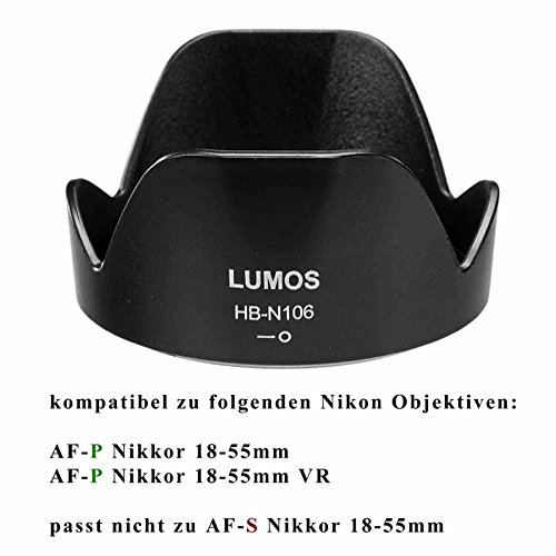LUMOS Bajonett GEGENLICHTBLENDE ersetzt Nikon HB-N106 diffizil harmonisch auf das Nikon Objektiv AF-P Nikkor 18-55mm (ACHTUNG: Sonnenblende passt nicht zu AF-S Nikkor 18-55 mm )