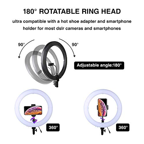 [Biegbarer Armständer und 360 ° -Drehung] In der Mitte des LED-Ringlichts befindet sich ein biegbarer Armständer, der einen Telefonhalter stützt. Dadurch kann mehr Platz gespart werden. Mit dem 1/4 „Mini Ball Head Hot Shoe kann das LED-Ringlicht um 360 Maß gedreht werden. Sie können den Winkel einsetzen, um das perfekte Licht nach Bedarf bereitzustellen.
