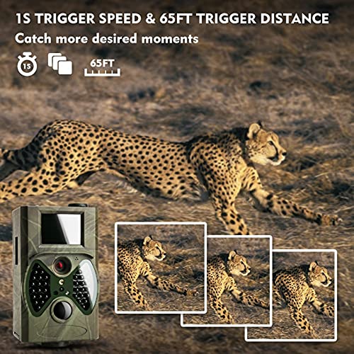 0,2S AUSLÖSUNGSGESCHWINDIGKEIT & 120° ERKENNUNGSWINKEL: Verbesserte 3 Infrarot-Bewegungssensoren mit 1 Sekunde schneller Auslösegeschwindigkeit, üppig schneller und effizienter, diese Jagdbewegungskamera ermöglicht es Ihnen, jede erkannte Bewegung schnell und akkurat zu erfassen. 120° Weitwinkelobjektiv mit 65 Fuß Erfassungsbereich für eine hervorragende breitere Sicht.