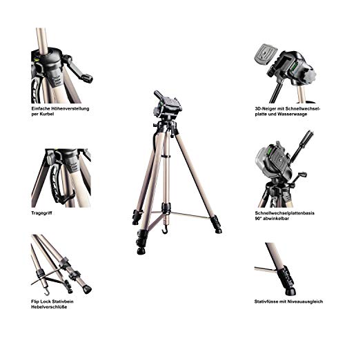 DETAILDATEN – Höhe: 55 – 146, Traglast: 3 kg; Gewicht: 1,07 kg, Packmaß: 58 cm, Schnellwechselplatte mit 1/4 Aufschlag Anschluss, 3 Beinsegmente mit 22, 18, 14 mm, Flip-Lock Hebelverschlüsse, Wasserwaage und Libelle, Handgriff, Kurbel, Mittelspinne, Lasthaken, Gummifüsse / mit Tasche / Material: Aluminium / Farbe: Bronze