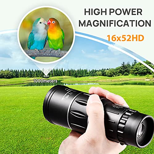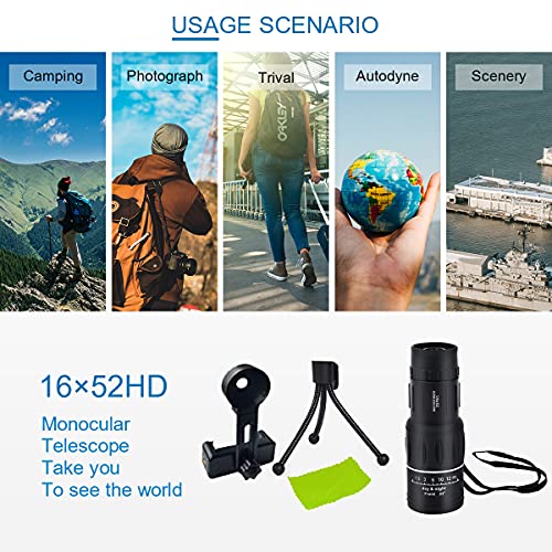 🔭【16X52 HD Monokular】: Dies ist ein Hochleistungs-Monokular-Teleskop, 16-fache Vergrößerung und ein Monokular mit 52 mm Objektivdurchmesser sorgen, Perfekt zum Wandern, Jagen, Klettern, Vogelbeobachtung, Ballspiele, Konzerte, Beobachten von Wildtieren und Landschaften.