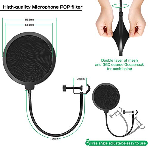 【FILTERBAR, EINSTELLBAR & FLEXIBEL】: Der Screen Pop-Filter besteht aus einem doppellagigen Mesh-Design, das alle unnötigen Hintergrundgeräusche herausfiltern kann. Mit 360 Grad Schwanenhals Ebenbild, wird dieser flexible Popflter für eine präzise Positionierung verwendet, sodass Sie den richtigen Winkel einstellen, um Ihre perfekte Stimme zu vorzeigen können. Die vier zusätzlichen Kabelbinder können helfen, das Mikrofonkabel während der Installation zu sichern.